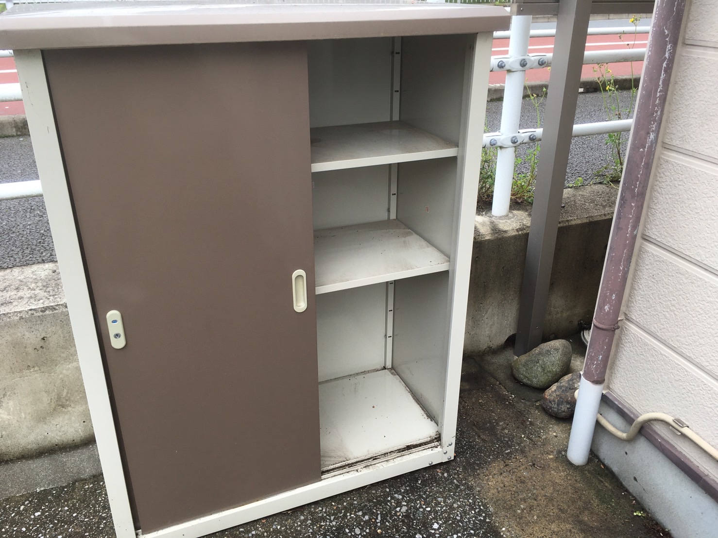 まずは外回りにある物置から拝見すると、金属製で比較的軽量タイプ。